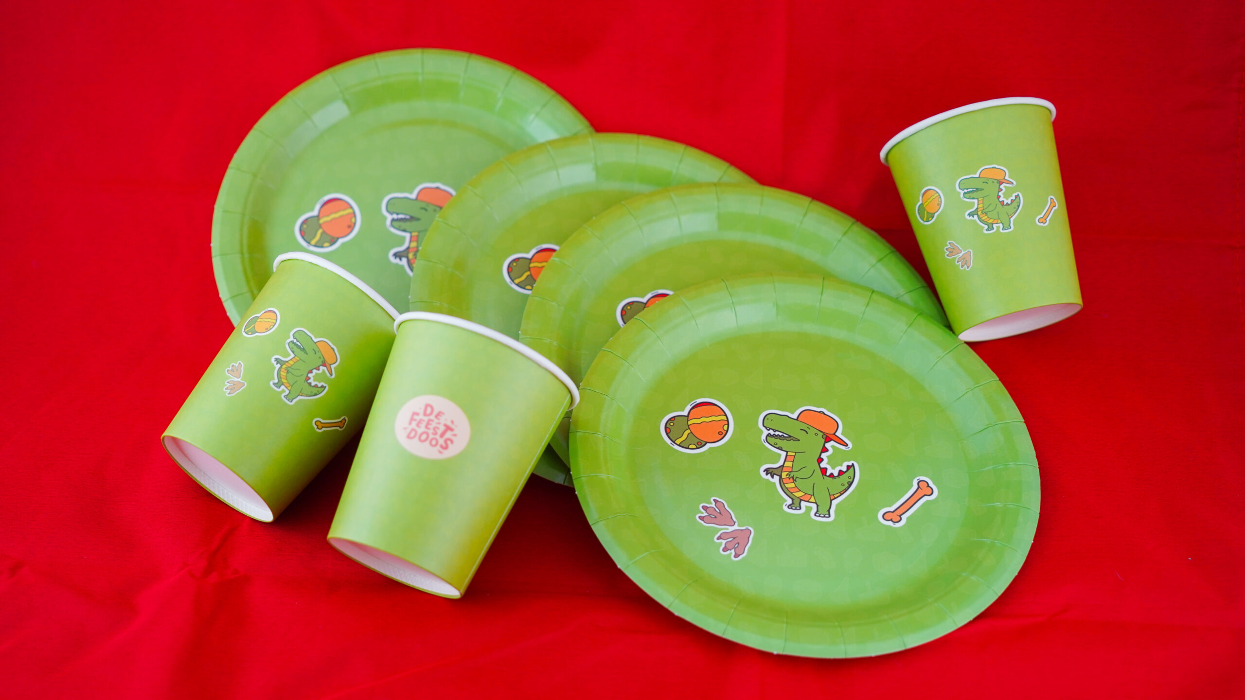 🦕 Coole dino-uitnodigingen 🌿 Tafelkleed, bordjes, bekertjes, ballonnen en slingers 🧩 Speurtocht van Flex de T-Rex en afwasbare tattoo 🦴 Graaf het dino-ei uit 🎁 Goodiebag met verrassing voor elk kind